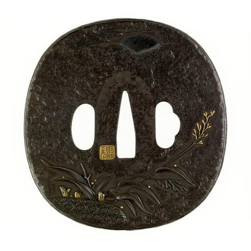 Keywords: Ueda Kazutsune - Tsuba with a "Ja-kago" (Gabion) and Reeds - Walters 5191.jpg This autumn theme shows seasonal plants alongside a bamboo basket filled with stones under a full moon Baskets of this type were used for erosion control along river banks so the image also invokes water The reverse side continues the botanical theme Autumn is the traditional season of moon viewing and this tsuba evokes the quiet of an autumn night between 1848 1868 late Edo iron gold detail cm 8 5 8 2 accession number 51 91 1104 Henry Walters Baltimore date and mode of acquisition unknown Walters Art Museum Henry Walters Acquired by Henry Walters Signature Tansuishi; Seal gen in place of origin Wakayama Japan Walters Art Museum license Tosogu Japanese sword fittings in the Walters Art Museum Ueda Kazutsune Media contributed by the Walters Art Museum needs category review |
