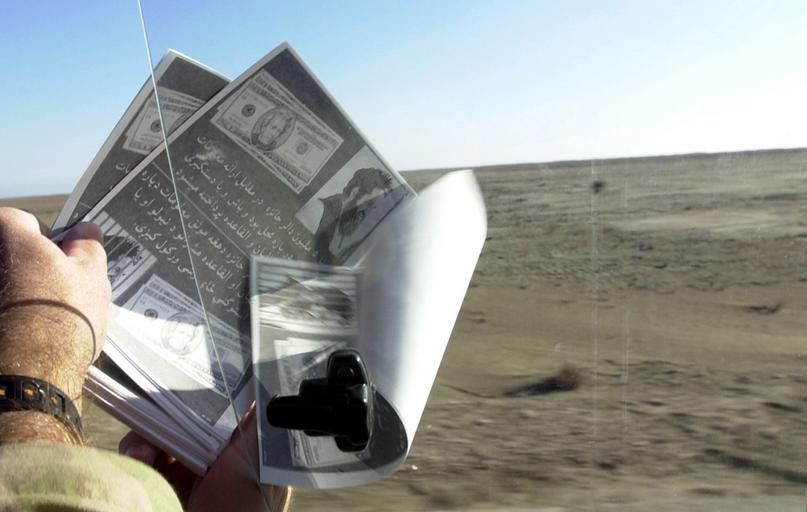 Keywords: US Navy 011218-F-3961R-003 Army Civial Affairs distibute leaflets in their serach for Osama Bin Laden.jpg en Mazar-e Sharif Afghanistan Dec 18 2001 -- US Army Civil Affairs soldiers distribute leaflets announcing the bounty on Osama Bin Laden's head U S Navy Photo by Staff Sgt Cecilio Ricardo USAF RELEASED 2001-12-18 011218-F-3961R-003 Navy http //www navy mil/view_image asp id 2062 U S Navy Photo by Staff Sgt Cecilio Ricardo USAF PD-USGov-Military-Navy December 2001 in Afghanistan Civil Affairs Hand bills Mazar-e-Sharif United States Army in the War in Afghanistan 2001-present Documents associated with the War in Afghanistan 2001-present Psychological operations in the War in Afghanistan 2001-present December 2001 photographs Military people in 2001 Desert Camouflage Uniform in 2001 18 December Photos taken with Nikon D1 |