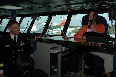 Keywords: US Navy 060421-N-1332Y-034 Commander, Carrier Strike Group five (CSG-5), Rear Adm. Douglas McClain, conducts a tour of USS Kitty Hawk's (CV 63) navigation bridge for members of the Japanese American Wives Association.jpg en Yokosuka Japan April 21 2006 - Commander Carrier Strike Group five CSG-5 Rear Adm Douglas McClain conducts a tour of USS Kitty Hawk's CV 63 navigation bridge for members of the Japanese American Wives Association JAWA Tours of Kitty Hawk are conducted to increase public awareness of the aircraft carrier's mission and capabilities Currently in port Kitty Hawk demonstrates power projection and sea control as the U S Navy's only permanently forward-deployed aircraft carrier U S Navy photo by Photographer's Mate Airman Adam York RLEASED 2006-04-21 060421-N-1332Y-034 Navy http //www navy mil/view_image asp id 33879 U S Navy photo PD-USGov-Military-Navy Bridges nautical |