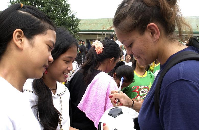 Keywords: US Navy 060816-N-4104L-055 Engineman 3rd Class Claire Aguirre autographs a soccer ball at the Iram Resettlment Area High School.jpg en Olongapo City Philippines Aug 16 2006 - Engineman 3rd Class Claire Aguirre autographs a soccer ball at the Iram Resettlment Area High School Aguirre assigned to the rescue and salvage ship USS Salvor ARS 52 and 20 other Sailors from exercise Cooperation Afloat Readiness and Training CARAT task group ships volunteered for an afternoon of sports activities CARAT is an annual series of bilateral maritime training exercises between the United States and six Southeast Asia nations designed to build relationships and enhance the operational readiness of the participating forces U S Navy photo by Senior Chief Mass Communication Specialist Melinda Larson RELEASED 2006-08-16 060816-N-4104L-055 Navy http //www navy mil/view_image asp id 38080 U S Navy photo by Senior Chief Mass Communication Specialist Melinda Larson PD-USGov-Military-Navy Aboard USNS Salvor T-ARS-52 Cooperation Afloat Readiness and Training 2006 Engineman United States Navy |
