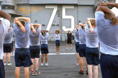 Keywords: US Navy 070820-N-2699R-569 Cryptologic Technician (Collection) 1st Class Adrienne Taylor leads a group of chief selectees in cool down stretching after an early morning physical training session.jpg en ATLANTIC OCEAN Aug 20 2007 - Cryptologic Technician Collection 1st Class Adrienne Taylor leads a group of chief selectees in cool down stretching after an early morning physical training session on the flight deck aboard Nimitz-class aircraft carrier USS Harry S Truman CVN 75 This marked one of many physical training sessions the selectees will go through during their chief induction where they are transformed from first class petty officers into chief petty officers Truman is underway in the Atlantic Ocean conducting carrier qualifications U S Navy photo by Chief Mass Communication Specialist Michael J Roberts RELEASED 2007-08-20 070820-N-2699R-569 Navy http //www navy mil/view_image asp id 49751 U S Navy photo by Chief Mass Communication Specialist Michael J Roberts PD-USGov-Military-Navy Cryptologic Technician Aboard USS Harry S Truman CVN-75 75 number Stretching Both hands behind head Perspiration Grey T-shirts Shorts |