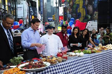 Keywords: US Navy 100529-N-3041C-068 Navy Culinary Specialist 1st Class Keith Combo and Coast Guard Food Service Specialist 2nd Class Robert Runn compete in a cookout on ABC's Good Morning America in Times Square.jpg en NEW YORK May 29 2010 Navy Culinary Specialist 1st Class Keith Combo and Coast Guard Food Service Specialist 2nd Class Robert Runn compete in a cookout on ABC's Good Morning America in Times Square as a part of Fleet Week New York 2010 Approximately 3 000 Sailors Marines and Coast Guardsmen are participating in the 23rd Fleet Week New York which is taking place through June 2 Fleet Week has been New York City's celebration of the sea services since 1984 U S Navy photo by Mass Communication Specialist Seaman Jennifer Castillo/Released 2010-05-29 100529-N-3041C-068 Navy http //www navy mil/view_image asp id 86161 U S Navy photo by Mass Communication Specialist Seaman Jennifer Castillo PD-USGov-Military-Navy Fleet Week New York 2010 Outdoor barbecues Good Morning America |