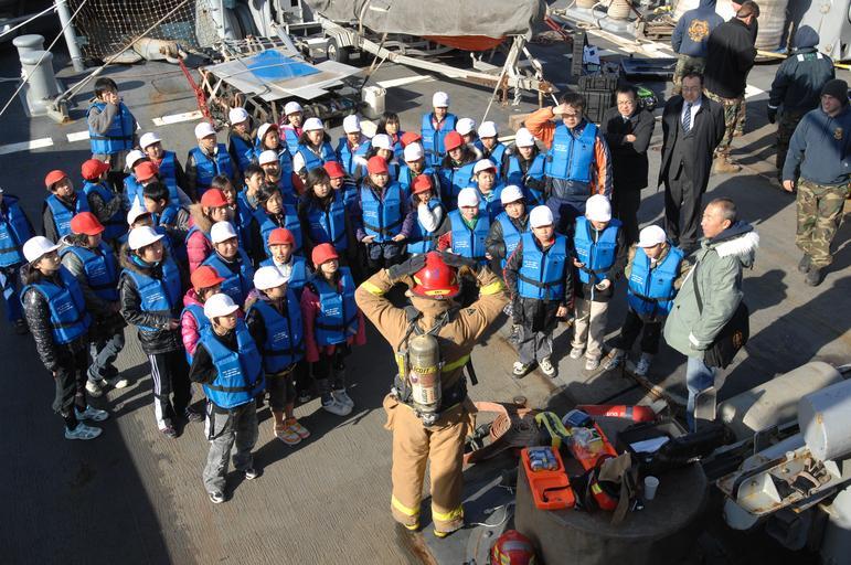 Keywords: US Navy 111122-N-ZI955-177 Navy Diver 2nd Class Quentin Case, from Butte, Mont., explains how to properly wear shipboard firefighting gear during a.jpg en ONAGAWA Japan Nov 22 2011 Navy Diver 2nd Class Quentin Case from Butte Mont explains how to properly wear shipboard firefighting gear during a tour aboard the Military Sealift Command rescue and salvage ship USNS Safeguard T-ARS 50 While Safeguard is conducting a port visit to Onagawa the crew will assist with community service projects and conduct tours of the ship Onagawa was devastated by the Great East Japan Earthquake March 11 2011 which triggered a massive tsunami that swept through the area Safeguard is the first U S Navy ship to visit the area since Operation Tomodachi concluded U S Navy photo by Senior Chief Mass Communication Specialist Daniel Sanford/Released 2011-11-22 111122-N-ZI955-177 Navy http //www navy mil/view_image asp id 110886 U S Navy photo by Senior Chief Mass Communication Specialist Daniel Sanford PD-USGov-Military-Navy Aboard USNS Safeguard T-ARS-50 |