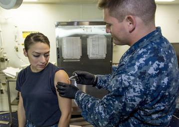 Keywords: USS Makin Island activity 151022-N-NR851-008.jpg en 151022-N-NR851-008SAN DIEGO Oct 22 2015 Hospital Corpsman 3rd Class Michael Waltz a native of San Diego administers an influenza vaccine to Aviation Electronics Technician 3rd Class Angelica Llamas a native of Fort Worth Texas aboard the amphibious assault ship USS Makin Island LHD 8 Makin Island is in a planned maintenance availability at its homeport in Naval Base San Diego U S Navy photo by Mass Communication Specialist 3rd Class Dennis Grube/Released 2015-10-22 Petty Officer 3rd Class Dennis Grube https //www dvidshub net/image/2247089 151022-N-NR851-008 2015-10-23 18 44 SAN DIEGO CA US 3 PD-USGov-Military-Navy Naval Base San Diego USS Makin Island LHD-8 Images from DoD uploaded by FĂŚ |