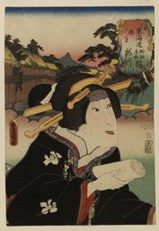 Keywords: Utagawa Toyokuni III - Tokaido Gojusan Tsugi no Uchi - Walters 95762.jpg The actor Iwai Hanshirō VII in the role of Tsuchiya Umegawa The courtesan Umegawa holds a roll of paper given to her by her lover's father Her lover Chubei has taken her to his home town but when they see Chubei's father fall down only Umegawa is willing to lend a helping hand When she asks the old man for some of the paper he uses to mend his sandal he realizes that Umegawa must be his son's betrothed 1852-09 late Edo pigments mulberry paper cm 35 08 24 13 accession number 95 762 15564 Robert S Shaull date and mode of acquisition unknown Walters Art Museum Henry Walters Bequest of Robert S Shaull 1990 Artist signature 'Toyokuni ga'; censor seals 'Hama' and 'Magome' place of origin Japan 006-4818 Walters Art Museum license 2D Japanese prints in the Walters Art Museum Historic samurai prints Utagawa Kunisada Media contributed by the Walters Art Museum needs category review |