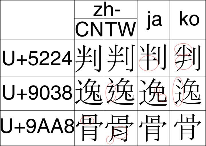 Keywords: Vergleich zh-Hant-CN zh-Hant-TW ja-Hani ko-Hani.svg en Comparison of the characters 判 é ¸ 骨 traditional variants for Chinese Mainland Chinese Taiwan Japanese Korean user Ktoetx own Unicode Comparisons of different sets of Chinese characters |