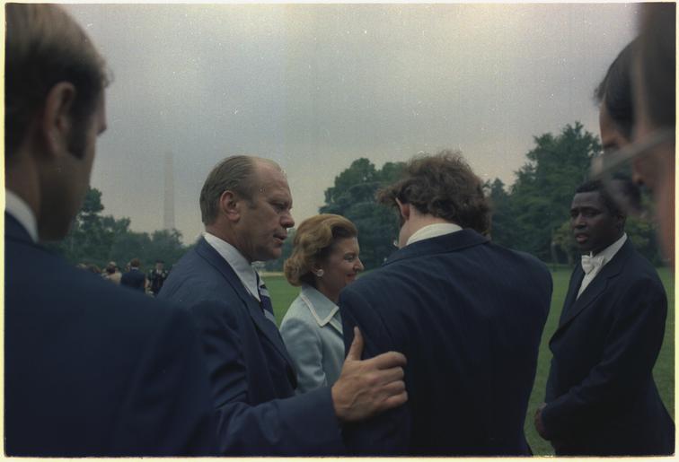 Keywords: Vice President Ford consoling David Eisenhower as Nixon departs from the White House - NARA - 194598.tif Scope and content Pictured Gerald R Ford Betty Ford David Eisenhower Subject Last Day General notes 194598 Local identifier NLRN-WHPO-E3393C-30A General Services Administration National Archives and Records Service Office of Presidential Libraries Office of Presidential Papers 01/20/1969 - ca 12/1974 Most Recent <br /> President 1969-1974 Nixon White House Photo Office 1969 - 1974 Most Recent NARA-Author Atkins Oliver F 1916-1977 Photographer 8451334 <br /> Richard Nixon Library NLRN 18001 Yorba Linda Boulevard Yorba Linda CA 92886 1974-08-09 Record group Collection RN-WHPO White House Photo Office Collection Nixon Administration 01/20/1969 - 08/09/1974 Record group ARC 1179 Nixon White House Photographs compiled 01/20/1969 - 08/09/1974 documenting the period 08/08/1968 - 08/09/1974 Series ARC 194277 File unit File unit ARC Variant control numbers NAIL Control Number NLNP-WHPO-MPF-E3393C 30A yes Other versions NARA-cooperation PD-USGov Photographs by Ollie Atkins |