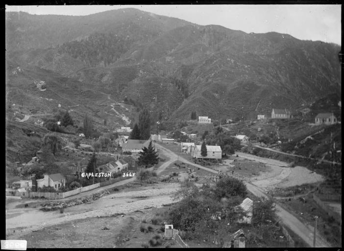 Keywords: blackandwhite monochrome outdoor photo border black and white View of the gold-mining settlement at Capleston, alongside Boatmans Creek, in the West Coast Region. Photograph taken 1910s by William Archer Price. Inscriptions: Inscribed - Photographer's title on negative -bottom left: Capleston. [No.] 366.E. Quantity: 1 b&w original negative(s). Physical Description: Dry plate glass negative 4.5 x 6.5 inches View of Capleston, a gold-mining settlement on Boatmans Creek, a minor tributary of the Inangahua River. Price, William Archer, 1866-1948 :Collection of post card negatives. Ref: 1/2-001897-G. Alexander Turnbull Library, Wellington, New Zealand. natlib.govt.nz/records/22349170 View of the gold-mining settlement at Capleston, alongside Boatmans Creek, in the West Coast Region. Photograph taken 1910s by William Archer Price. Inscriptions: Inscribed - Photographer's title on negative -bottom left: Capleston. [No.] 366.E. Quantity: 1 b&w original negative(s). Physical Description: Dry plate glass negative 4.5 x 6.5 inches View of Capleston, a gold-mining settlement on Boatmans Creek, a minor tributary of the Inangahua River. Price, William Archer, 1866-1948 :Collection of post card negatives. Ref: 1/2-001897-G. Alexander Turnbull Library, Wellington, New Zealand. natlib.govt.nz/records/22349170 |