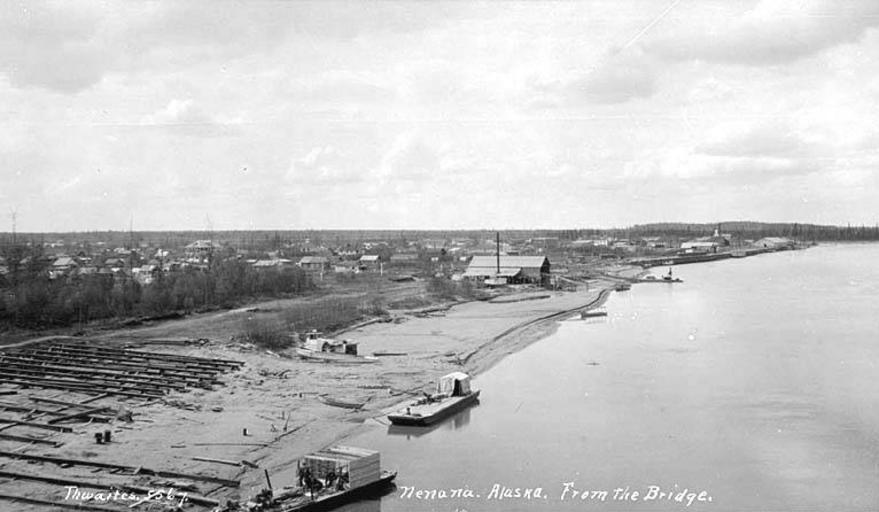 Keywords: View of Nenana, ca 1912 (THWAITES 324).jpeg check categories 27 October 2016 3 Photograph Creator John E Thwaites Caption on image Nenana Alaska from the bridge PH Coll 247 765<br/>Nenana is located in Interior Alaska 55 road miles southwest of Fairbanks on the George Parks Highway Nenana is located at mile 412 of the Alaska Railroad on the south bank of the Tanana River just east of the mouth of the Nenana River It lies 304 road miles northeast of Anchorage Nenana is in the westernmost portion of Tanana Athabascan Indian territory It was first known as Tortella an interpretation of the Indian word Toghotthele which means mountain that parallels the river Early explorers such as Allen Harper and Bates first entered the Tanana Valley in 1875 and 1885 However the Tanana people were accustomed to contact with Europeans due to trading journeys to the Village of Tanana where Russians bartered Western goods for furs The discovery of gold in Fairbanks in 1902 brought intense activity to the region A trading post/roadhouse was constructed by Jim Duke in 1903 to supply river travelers and trade with Indians St Mark's Episcopal mission and school was built upriver in 1905 Native children from other communities such as Minto attended school in Nenana A post office opened in 1908 By 1909 there were about 12 000 residents in the Fairbanks area most drawn by gold mining activities In 1915 construction of the Alaska Railroad doubled Nenana's population The Nenana Ice Classic - a popular competition to guess the date and time of the Tanana River ice break-up each spring - began in 1917 among surveyors for the Alaska Railroad The community incorporated as a city in 1921 The Railroad Depot was completed in 1923 when President Warren Harding drove the golden spike at the north end of the 700-foot steel bridge over the Tanana River Nenana now had a transportation link to Fairbanks and Seward According to local records 5 000 residents lived in Nenana during this time however completion of the railroad was followed by an economic slump The population in 1930 was recorded at 291 In 1961 Clear Air Force Station was constructed 21 miles southwest and many civilian contractors commuted from Nenana A road was constructed south to Clear but north vehicles were ferried across the Tanana River In 1967 the community was devastated by one of the largest floods ever recorded in the Tanana Valley Subjects LCTGM Rivers--Alaska--Nenana Subjects LCSH Nenana Alaska ; Cities and towns--Alaska--Nenana; Tanana River Alaska ; Barges--Alaska--Nenana depicted place Nenana Alaska ca 1912 Institution University of Washington UWASH-THWAITES-source accession number thwaites 324 PD-old-auto-1923 1940 Information field Order Number THW338 Images from the John E Thwaites Photographs of Alaska Collection to check Nenana Alaska Tanana River Barges |