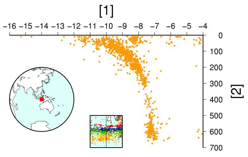 Keywords: Wadati-Benioff zone.png andre315 PD-USGov-Interior-USGS Data source http //neic usgs gov/ USGS-NEIC <br/> Created the 9th February 2007 with the free http //gmt soest hawaii edu/ GMT software <br/> 10 The Wadati-Benioff zone under the Lesser Sunda Islands latitude in degree hypocentre depth in km This plot shows the earthquake localizations on a South-North cross section for the lat -14°/-4° lon 114°/124° quadrant red square on the globe corresponding to the Lesser Sunda Islands region The localizations are extracted from the USGS database and corresponds to magnitude greater than 4 5 in the 1973-2004 time period shallow earthquakes with undetermined depth have been omitted La zone de Wadati-Benioff sous les Petites Îles de la Sonde Latitude en degrés Pronfondeur des hypocentres en km Ce shéma montre la localisation des tremblements de terre sur une section Sud-Nord de la région des Petites Îles de la Sonde carré rouge sur le globe Ces localisations sont extraites de la base de données de l'USGS et correspondent aux séismes de magnitude supérieur à 4 5 durant la période 1973-2004 les séismes superficiels ayant une profondeur non contrainte n'ont pas été représentés Seismograms |