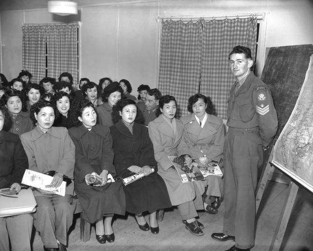 Keywords: australian war memorial australianwarmemorial blackandwhite monochrome indoor black and white 3/3522 Sergeant T. R. MacQuin of Australian Army Education Service stands in front of a class of Japanese war brides to give them information about Australia. Rights Info: No known copyright restrictions. This photograph is from the Australian War Memorial's collection www.awm.gov.au Persistent URL: cas.awm.gov.au/photograph/148580 3/3522 Sergeant T. R. MacQuin of Australian Army Education Service stands in front of a class of Japanese war brides to give them information about Australia. Rights Info: No known copyright restrictions. This photograph is from the Australian War Memorial's collection www.awm.gov.au Persistent URL: cas.awm.gov.au/photograph/148580 |