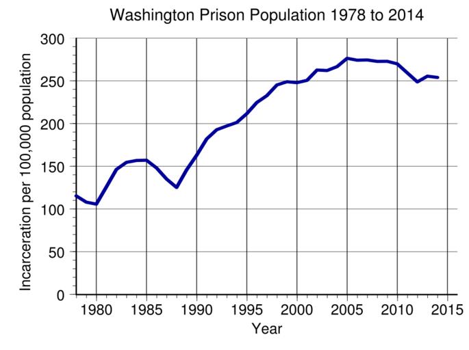 Keywords: Washington Prison Population.svg en Washington prison incarceration rate per 100 000 population from 1978 to 2014 Data from http //www bjs gov/index cfm ty nps BJS 2016-05-10 own Delphi234 other versions current annually Generated with Wikimedia SVG Chart SVG Chart/box cc-zero Prisons in Washington state Imprisonment and detention rates in the United States |