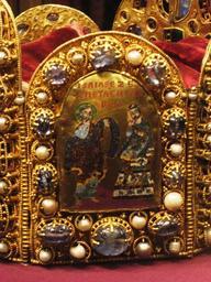Keywords: Weltliche Schatzkammer Wien (196).JPG Ezechias Hiskia mit dem Propheten Jesaja Die Reichskrone Westdeutsch 2 H 10 Jahrhundert; das Kronenkreuz einer Hinzufügung des frühen 11 Jahrhunderts; der Bügel aus der Zeit Kaiser Konrads II 1024-1039 ; die rote Samthaube aus dem 18 Jahrhundert Gold Email Zellenschmelz Edelsteine Perlen Stirnplatte H 14 9 cm B 11 2 cm ; Kronenkreuz H 9 9 cm SK Inv -Nr XIII 1 Hezekiah with the prophet Isaiah The Imperial Crown Western Germany 2nd half of the 10th century The cross is an addition from the early 11th century; the arch dates from the reign of Emperor Conrad II ruled 1024-1039 ; the red velvet cap is from the 18th century Gold cloisonné enamel precious stones pearls Brow plate H 14 9 cm W 11 2 cm; cross H 9 9 cm SK Inv No XIII 1 Own 2007-10 MyName Gryffindor Imperial Crown of the Holy Roman Empire Isaiah Hezekiah Secular and Ecclesiastical Treasury |