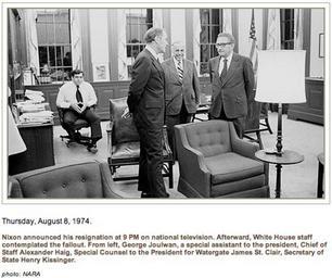 Keywords: White House staff after Richard Nixon resignation.jpg en Nixon announced his resignation at 9 PM on national television Afterward White House staff contemplated the fallout From left George Joulwan a special assistant to the president Chief of Staff Alexander Haig Special Counsel to the President for Watergate James St Clair Secretary of State Henry Kissinger 2014-07-08 12 54 55 http //americanradioworks publicradio org/features/prestapes/slide13 html NARA PD-USGov Uploaded with UploadWizard Resignation of Richard Nixon Alexander Haig Henry Kissinger |