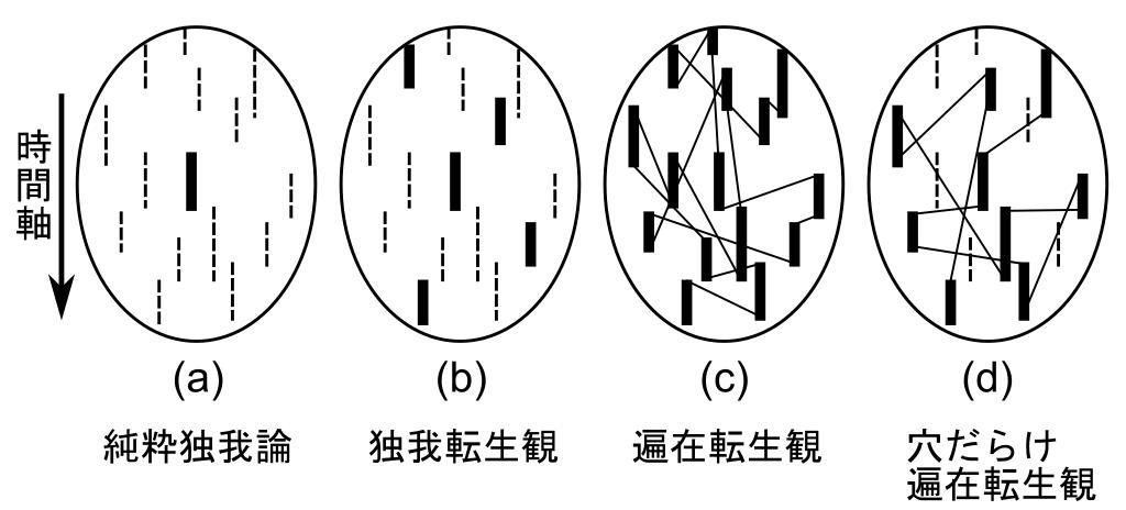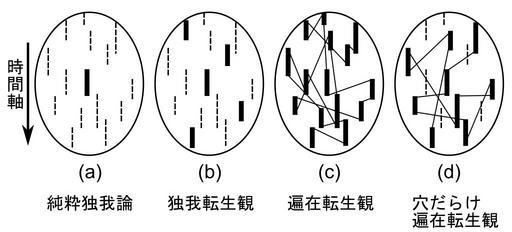 Keywords: Why am i me 4.svg Classification of possible positions about question Why am I myself rather than someone else or Why am I here and now by Tsuneo Watanabe pschologist philosopher professor at Toho University Japan The arrow at left indicates direction of time Past top to Future down a Pure solipsism b Solipsistic reincarnationism c Universal reincarnationism d Universal reincarnationism full of holes Tsuneo Watanabe himself pushes position c because of he thinks that is most elegant Tsuneo Watanabe's literature 1996 p 175 ISBN 978-4061493032 2012-05-02 own Inkscape Philosophy of mind Reincarnation Diagrams in Japanese |