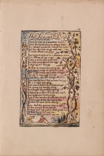 Keywords: William Blake - Songs of Innocence and of Experience, Plate 54, "The School Boy" (Bentley 53) - Google Art Project.jpg print brown pen ink black watercolor paper cream Relief etching printed in dark-brown with pen and black ink and watercolor on moderately thick slightly textured cream wove paper London 1757 London 1827 William male 2369124 Blake British 1757 - 1827 /collection/yale-center-for-british-art/artwork/songs-of-innocence-and-of-experience-plate-54-the-school-boy-bentley-53-william-blake/2387397/ William Blake Artist /artist/william-blake/4130035/ 4130035 /collection/yale-center-for-british-art/ Yale Center for British Art 2305845 http //britishart yale edu/ 2/23/2012 9 52 52 PM /collection/yale-center-for-british-art/artwork/songs-of-innocence-and-of-experience-plate-54-the-school-boy-bentley-53-william-blake/2387397/ 1789 1789 to 1794 kneeling branches leaf boys girls men women grass text vegetation trees vines historical subject Relief etching printed in dark-brown with pen and black ink and watercolor on moderately thick slightly textured cream wove paper 111 2387397 False 1794 3/25/2012 6 19 17 PM YCBA/lido-TMS-3777 http //collections britishart yale edu/vufind/Record/1668023 Yale Center for British Art Paul Mellon Collection print 1780 1800 Felpham Creation w70 x h111 cm 1789 to 1794 False 0 66796875 Volume songs-of-innocence-and-of-experience-plate-54-the-school-boy-bentley-53-william-blake Songs of Innocence and of Experience Plate 54 The School Boy Bentley 53 s 70 Inscribed in black ink upper right 54 Inscription _Signed_and_Dated Not signed not dated Not on View Relief etching printed in dark-brown with pen and black ink and watercolor on moderately thick slightly textured cream wove paper kneeling branches leaf boys girls men women grass text vegetation trees vines historical subject special url_id igGgBN6k-4xZWA PD-old-100-1923 1827 Songs of Innocence and Experience - Copy L Google Art Project works by William Blake Songs of Experience - The School Boy |