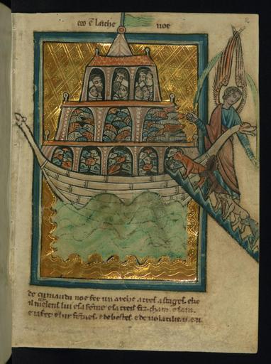 Keywords: William de Brailes - The Animals Enter Noah's Ark (Genesis 6 -13-7 -16) - Walters W1062R - Full Page.jpg Walters Art Museum artwork Creator William de Brailes This page from Walters manuscript W 106 depicts a scene from the story of Noah's ark God commanded Noah to build an ark of gopher wood with a roof and three decks Into the ark Noah brought two of every animal make and female On the lower deck are the animals on the middle the birds and on the upper deck Noah and his family The last birds are flying into the ark and the last animals are being escorted by an angel The flood has already started and the ark with its beast-headed prow and stern floats upon its waters pennant flying ca 1250 Medieval ink pigment parchment cm 13 2 9 5 accession number W 106 2R 8948 Léon Gruel Paris date and mode of acquisition unknown Henry Walters Baltimore June 6 1903 by purchase see The Diaries of George Lucas Walters Art Museum Henry Walters Acquired by Henry Walters 1903 Transliteration Above the image ceo est l'arche noe; Transliteration Below the image de cumanda noe fer un arche a tres astages e ke il meist lens lui e sa femme e sa treis fiz cham e sam e iafet e lur femmes e de bestes e de volatilie ii e ii ; Translation Below the image God commanded that Noah make a three-leveled ark and that he put in it himself and his wife and their three sons Cham Sam and Iafet and their wives and pairs of beasts and birds place of origin Oxford England United Kingdom Walters Art Museum license 2D Walters MS W106 - Bible Pictures by William de Brailes Media contributed by the Walters Art Museum needs category review Noah's Ark in miniatures |