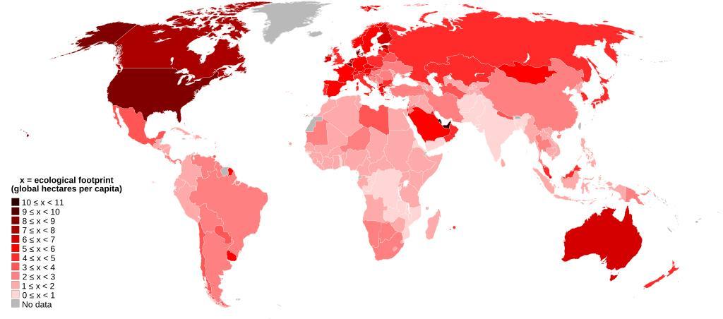 Keywords: World map of countries by ecological footprint (2007).svg ecological footprint in 2007 published on 13 October 2010 by the Global Footprint Network It is measured by the amount of global hectares that are affected by humans per capita of the country Lighter shades denote countries with a lower ecological footprint per capita and darker shaded for countries with a higher ecological footprint per capita The total ecological footprint global hectares affected by humans is measured as a total of six factors cropland footprint grazing footprint forest footprint fishing ground footprint carbon footprint and built-up land <math>\mathrm x \frac \mathrm global\ hectares\ affected\ by\ humans \mathrm population </math> Mapemonde colorée selon l'empreinte écologique moyenne des habitants de chaque pays exprimée en ha par personne en 2007 Le tons plus chairs correspondent à une empreinte faible les tons plus sombres à une empreinte plus forte Six facteurs sont pris en compte pour mesurer cette empreinte L'agriculture le pâturage l'exploitation forestière la pêche la production de carbone et l'urbanisation <math>\mathrm x \frac \mathrm empreinte\ ecologique\ nationale \mathrm population </math> B9B9B9 No data FFD5D5 0 ‰¤ x < 1 FFAAAA 1 ‰¤ x < 2 FF8080 2 ‰¤ x < 3 FF5555 3 ‰¤ x < 4 FF2A2A 4 ‰¤ x < 5 FF0000 5 ‰¤ x < 6 D40000 6 ‰¤ x < 1 AA0000 7 ‰¤ x < 8 800000 8 ‰¤ x < 9 550000 9 ‰¤ x < 10 2B0000 10 ‰¤ x < 11 Self-made with data from list of countries by ecological footprint 2010-10-29 Jolly Janner <gallery> File World map of countries by ecological footprint svg 2006 </gallery> Ecological footprint maps of the world |
