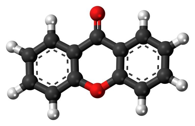 Keywords: Xanthone-3D-balls.png Ball-and-stick model of the xanthone molecule the parent compound of the xanthonoids chemical series Colour code 505050 Carbon C black<br> F0F0F0 Hydrogen H white<br> F51E1E Oxygen O red<br> 2011-02-12 own DS Visualizer Jynto talk Space-filling version cc-zero Xanthones Images by Jynto |