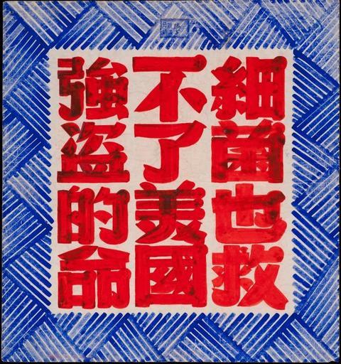 Keywords: Xi jun ye jiu bu liao Meiguo qiang dao de ming = Even germs cannot save the fate of the American bandits..JPG en A statement in twelve bold red characters written in Chinese traditional style and framed with indigo blue pattern proclaims that not even germs can save American bandits 2013-09-27 09 11 53 Courtesy of the National Library of Medicine Images from the History of Medicine IHM http //ihm nlm nih gov/images/E00172 Also showcased in the book Hidden Treasure New York NY Blast Books 2012 p 198 HMD Prints Photos call number PP060179 map China s n 1952 Custom license marker 2013 09 27 PD-USGov Uploaded with UploadWizard Biological warfare Korean War Posters Anti-American propaganda |